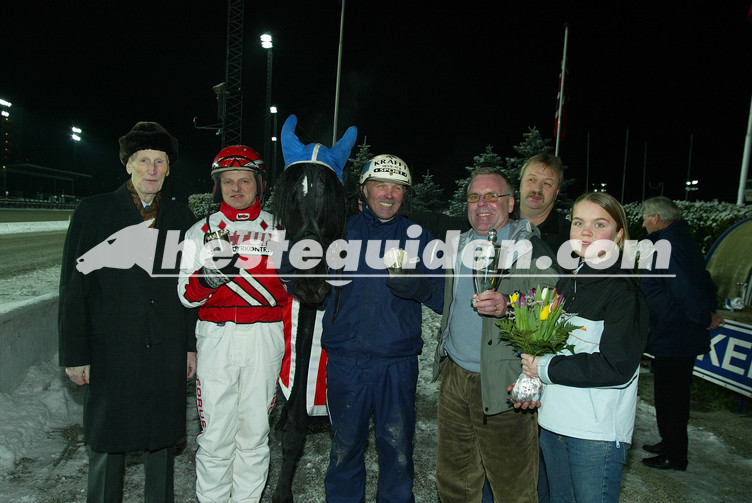 | Beskrivelse | Drammen12022005, eier Oddvar Riis (t.v), Morten Bergene, Risla, kusk Vidar Hop, Pål Sem, Inger Sem og Anne Gjestemoen etter seieren i 6.løp, V75-3, Arne Sems minneløp. Foto: Anders Kongsrud/hesteguiden.com |
